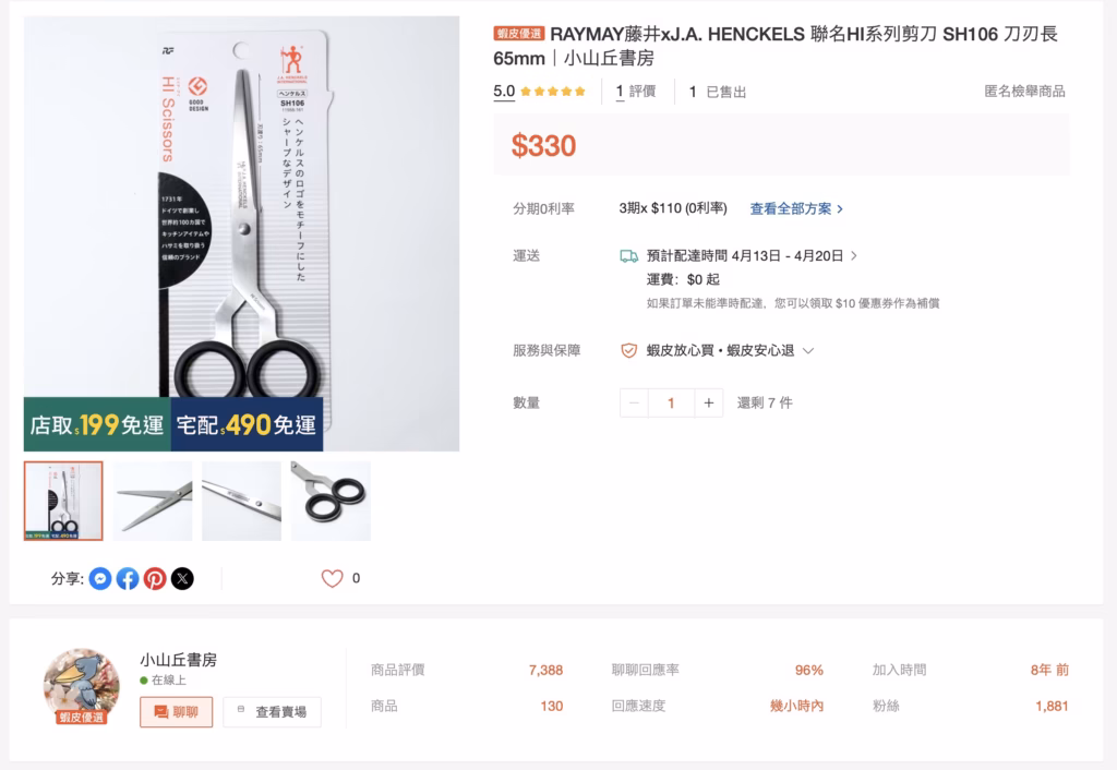 2. RAYMAY藤井官網:HI Scissors介紹網頁庫存頁面