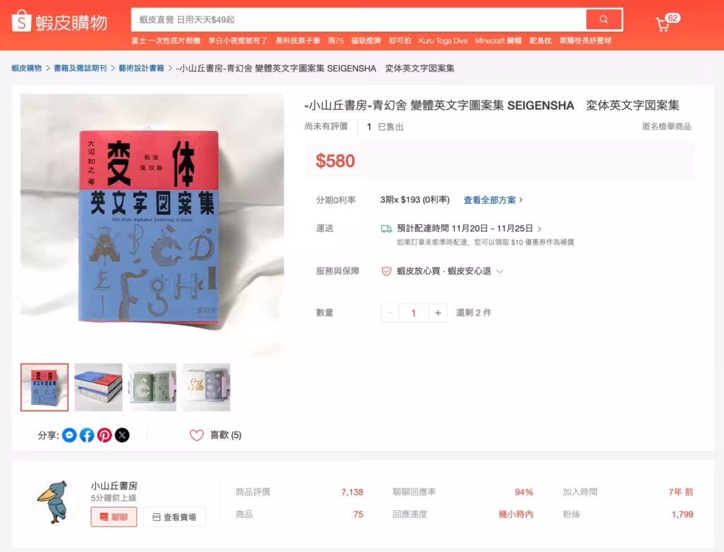 當然啦,小山丘書房也有販賣《變體英文字圖案集》喔!快點到小山丘書房的蝦皮賣場選購吧!