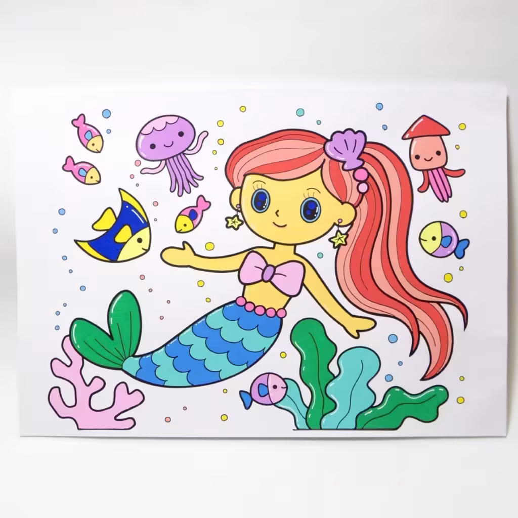POSCA的顏色飽滿又纖豔但不妖(?)。如果仔細看的話,可以看到美人魚的尾巴、眼睛還有其他小動物上反光光澤的白色線條,是最後才畫上去的喔!POSCA覆蓋性真的是很好。